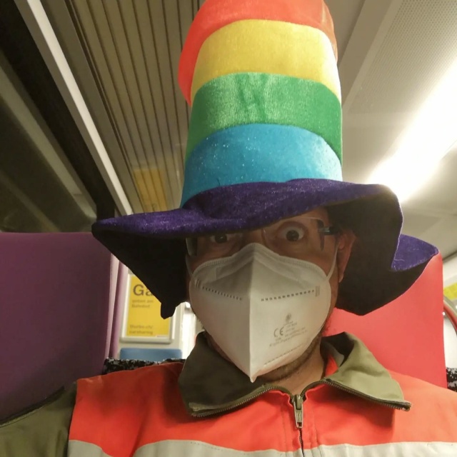 @FlohEinstein The image shows a person sitting inside a train or subway car. The individual is wearing a large, colorful hat with horizontal stripes in the colors of the rainbow: red, orange, yellow, green, blue, and purple. The hat has a wide brim and a tall, cylindrical shape. The person is also wearing a high-visibility jacket with an orange and gray color scheme, featuring a zipper and a collar. They are wearing a white face mask. The background includes the interior of the train, with purple seats and a yellow sign partially visible. The lighting is bright, typical of indoor public transportation.